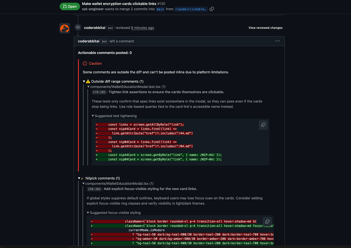 CodeRabbit catching test gaps and accessibility issues with suggested fixes