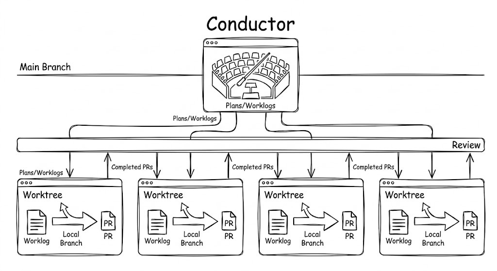 In practice, this means one main editor window stays on develop and orchestrates. It creates git worktrees, writes worklogs, and delegates. Each execution window opens in its own worktree, follows its assigned worklog, commits, pushes, and opens a PR. The main window never implements. It plans and coordinates.