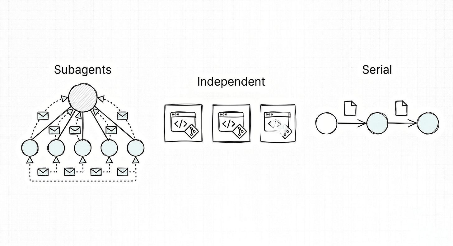 The decision rule is simple: subagents for parallel research, independent sessions for isolated implementation, serial handoffs for dependency-heavy or long-lived work. Most real workflows mix all three.