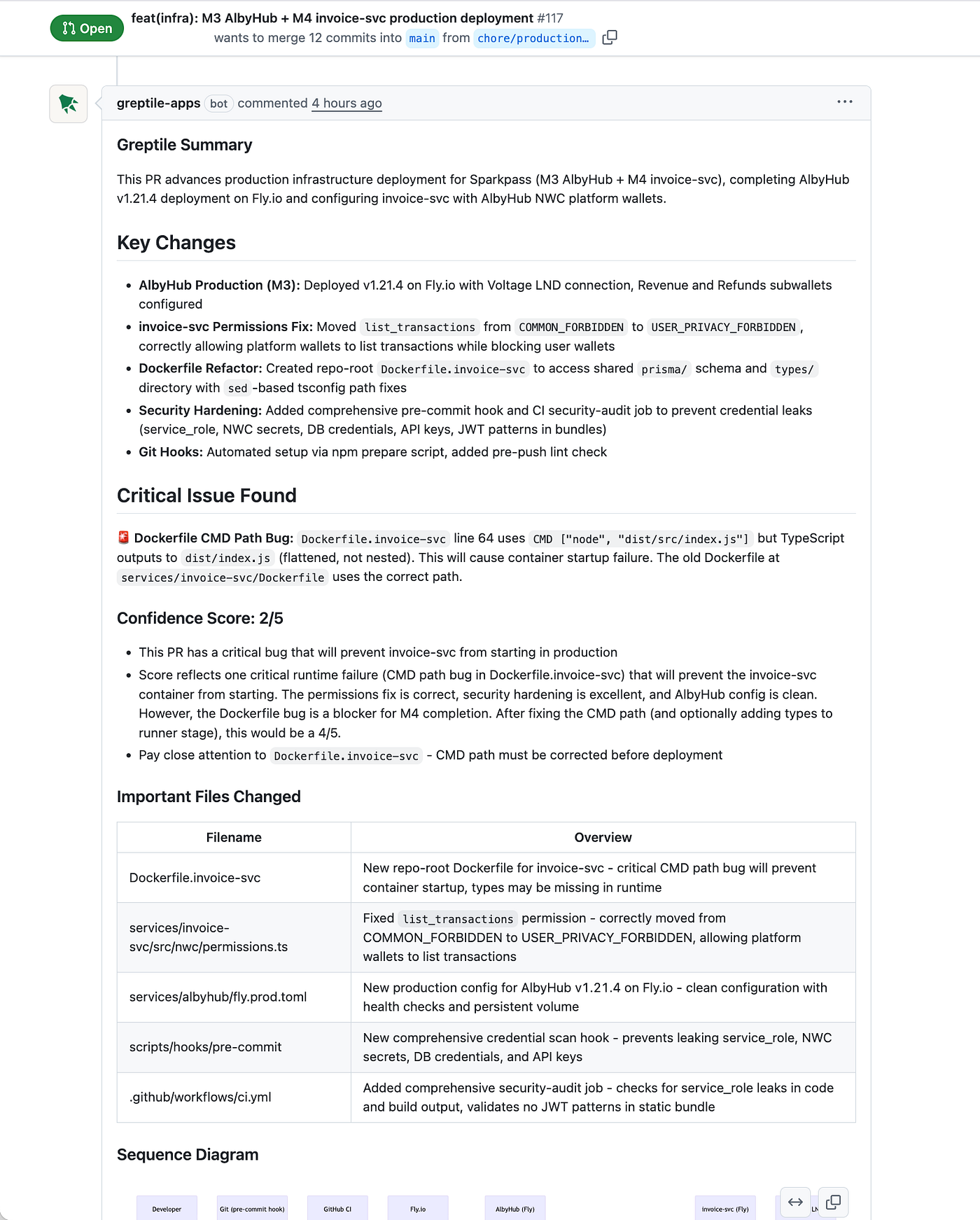 The specific tools matter less than the pattern. For my personal projects, I use Greptile for confidence scoring (a 2/5 score has consistently flagged real problems) and CodeRabbit for deep static analysis and auto-generated sequence diagrams. But any tool that gates the mechanical layer works.