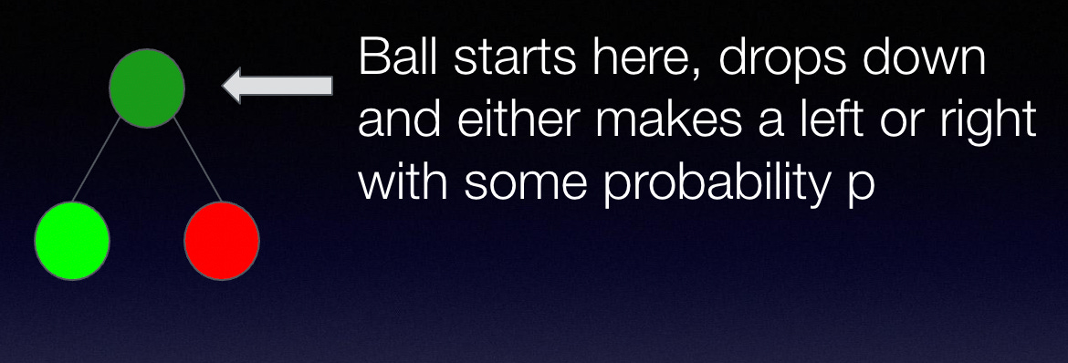If you noticed that each path resembles a tree, you would be right, as our path is essentially a discrete random walk with a number of steps over a time t, where with some probability the ball drops left or right as it hits a peg.